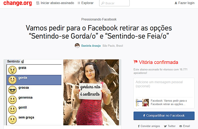 Tal petição tomou grande proporção e teve mais de 16 mil assinaturas, o que levou o Facebook a retirar essa opção de status.