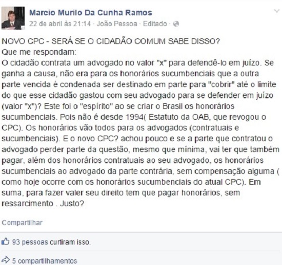 Em post publicado em sua página pessoal no Facebok, o desembargador do TJ/PB Marcio Murilo da Cunha Ramos manifestou certa indignação com o pagamento de honorários sucumbenciais aos advogados. Na publicação, o magistrado questiona se é “justo” o pagamento tendo em vista que o cidadão contrata um causídico por determinado valor para defendê-lo em juízo. “Se ganha a causa, não era para os honorários sucumbenciais que a outra parte vencida é condenada ser destinado em parte para ‘cobrir’ até o limite do que esse cidadão gastou com seu advogado para se defender em juízo?