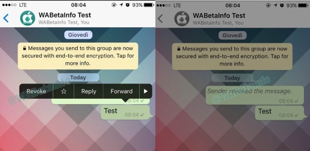 De acordo com a plataforma, a funcionalidade vai permitir que usuários anulem mensagens enviadas para um grupo ou numa conversa individual. No entanto, há um tempo limite para isso: cinco minutos. Após este período, a mensagem não vai ser mais apagada.