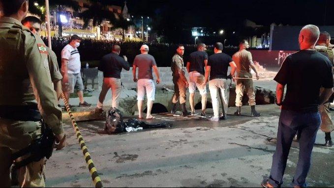 Na noite desta segunda-feira, durante evento de Natal em Joinville (SC), parte de uma calçada sobre o rio Cachoeira cedeu e diversas pessoas caíram na cratera que se abriu. Segundo informações do G1, ao menos 11 crianças e 19 adultos foram levados ao hospital, mas não há vítimas graves.