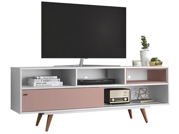 Se você procura um móvel retrô para fazer combinações na sua sala mais e deixá-la bonita e despojada, o rack Retrô Lyon da Olivar Móveis é o modelo ideal. Além de ter capacidade para uma TV de até 48", ele possui 4 prateleiras para que seus enfeites fiquem em exposição, como livros, porta-retratos, vasos, ou ainda seus aparelhos eletrônicos como consoles, assistentes virtuais e outros. Além disso, ele conta com uma porta deslizante e um nicho sobreposto, para que você possa organizar e guardar seus DVD's, CD's, revistas e o que mais precisar com muito mais estilo. É produzido em MDP de qualidade, nas cores branco e rose, e possui pés em madeira formato palito, que além de dar um charme a mais para o produto, deixa seu cômodo ainda mais aconchegante e estiloso.