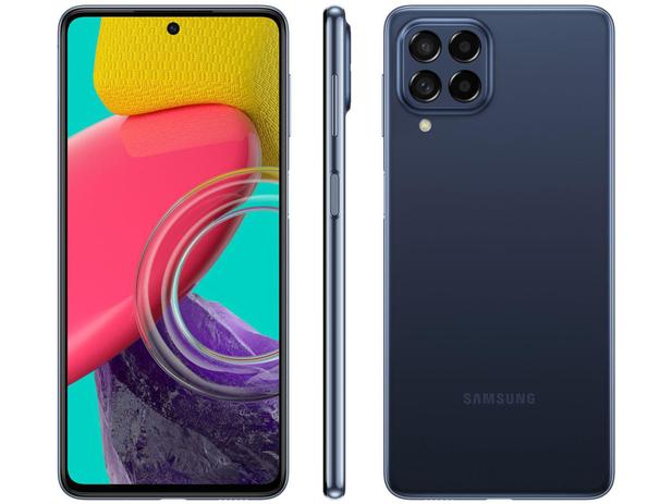Tenha tudo o que precisa ao mesmo tempo com o smartphone Galaxy M53 da Samsung. Ele é dual chip com tecnologia 5G e vem na cor azul. Conta com tela infinita Super AMOLED Plus de 6,7" FHD+ de 120Hz que faz com que você tenha espaço para ver e fazer mais com alta qualidade. O design de qualidade do M53 vem com bordas suaves e arredondadas e uma moldura mais fina, com um visual minimalista da câmera. Ele combina cores contemporâneas com um acabamento fosco na parte de trás, suave ao toque. A câmera selfie tem incríveis 32MP pra você sair muito bem nas fotos. Capture momentos memoráveis com detalhes claros com a câmera quadrupla sendo a principal de 108MP, com ela você poderá fazer fotos com muita qualidade. O produto possui processamento Octa-core com 8GB de memória RAM para alto desempenho durante o manuseio. Usufrua com a capacidade de 128GB da memória interna para guardar seus vídeos, fotos e os aplicativos de sua preferência.