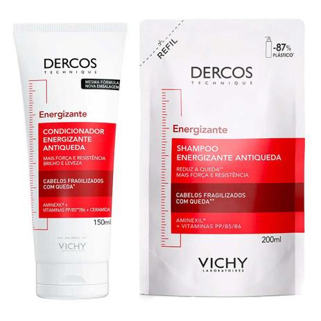 O Kit contém: 1 Condicionador - Vichy Dercos Energizante- 150ml 1 Shampoo Refil Vichy Dercos Energizante – 200 ml Dercos Condicionador de Vichy os cabelos recuperam o vigor e a vitalidade, desde a raiz até as pontas. Inovação antiqueda Dercos - com Aminexil, molécula Antiqueda patenteada, auxilia na redução do processo de rigidificação do colágeno, fenômeno ligado ao envelhecimento prematuro das raízes. Eficácia antiqueda comprovada. A queda do cabelo é acompanhada geralmente de uma rigidificação dos tecidos que envolvem a raiz. Comprimida, a raiz fixa-se menos no couro cabeludo e é alimentada com uma quantidade inferior de energia. Enfraquecida, ela produz uma fibra mais fina. Progressiva o cabelo afina-se, degrada-se e repele-se não nascendo mais. O couro cabeludo torna-se visível. Indicado: Cabelos enfraquecidos ou com queda capilar. Benefícios: • Ação antiqueda; • Cabelos mais fortes; • Restaura a vitalidade do cabelo; • Não resseca os fios. Resultados: • 78% dos usuários afirmam que deixa uma sensação de cabelos mais fortes. • 76% dos usuários afirmam que deixa uma sensação de cabelos revigorados. Modo de Usar: • Para uma melhor absorção do produto, massageie mecha por mecha e deixe agir por 1 minuto; • Enxaguar; • Uso Frequente. A linha Dercos Energizante é o tratamento Vichy para cabelos enfraquecidos e com queda. Pelo seu ativo patenteado Aminexil, o Shampoo Dercos Energizante promove ação antiqueda, além de também fortalecer os fios enfraquecidos, por conter complexo de vitaminas PP + B5 + B6. É o shampoo antiqueda mais recomendado por dermatologistas e agora em opção de refil mais sustentável, com -87% de plástico. Beneficios: -Ação Antiqueda Reforçada -Fortalece A Fibra Capilar -Hidrata E Dá Resistência Aos Fios Modo de usar: Despeje o conteúdo do refil em uma embalagem de Shampoo Dercos Energizante e utilize diariamente. A Super Ampola Capilar Dercos Energizante de Vichy é um tratamento capilar concentrado com ação antiquebra fortalecedora dos fios para hidratar profundamente e fortalecer o cabelo de dentro para fora. Indicada para todos os tipos de cabelo. Os cabelos ficam hidratados instantaneamente, mais fortes e resistentes à quebra e agressões externas desde o primeiro uso. Os resultados são potencializados em tratamento de uso continuo, uma vez por semana. Em maior ou menor intensidade, cada cabelo sofre perda de força e quebra. Por isso a importância de uma solução que vá além de um efeito superficial e fortaleça os fios, de dentro para fora.