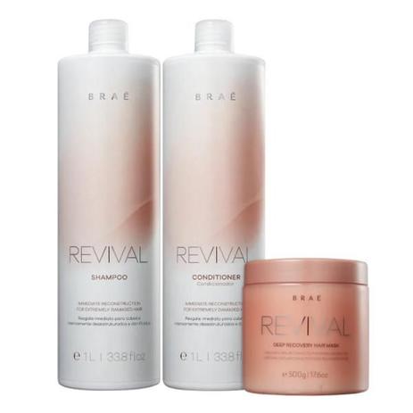 Brae Revival Shampoo e Condicionador 1L e Mascara 500g Kit de tratamento para cabelos danificados e fragilizados. Kit BRAÉ Revival forma uma camada protetora no fio e recupera os danos. Kit BRAÉ Revival repõe os nutrientes perdidos, melhora a elasticidade e restaura a saúde dos fios desde o seu interior. Perfeito para combater o frizz e garantir hidratação. Seu cabelo fica bonito e saudável rapidamente. Contém BRAÉ Revival - Shampoo 1000ml: faz uma limpeza suave e recupera os fios. BRAÉ Revival - Condicionador 1000ml: proporciona brilho, maciez e resgata as camadas sensibilizadas. BRAÉ Revival - Máscara de Reconstrução 500g: deixa o cabelo recuperado, resistente e com brilho. Conselho de Aplicação Aplique o shampoo no couro cabeludo molhado e massageie bem. Enxágue. Repita o procedimento se sentir necessidade. Em seguida, distribua a máscara mecha a mecha, começando pelas pontas. Massageie suavemente até chegar próximo à raiz. Deixe agir durante 25 minutos. Enxágue. Finalize com o condicionador no comprimento e pontas dos fios. Enxágue. Use a ponta dos dedos na hora de lavar o cabelo. Usar as unhas ou esfregar com força pode danificar e desgastar os fios, além de machucar a raiz.