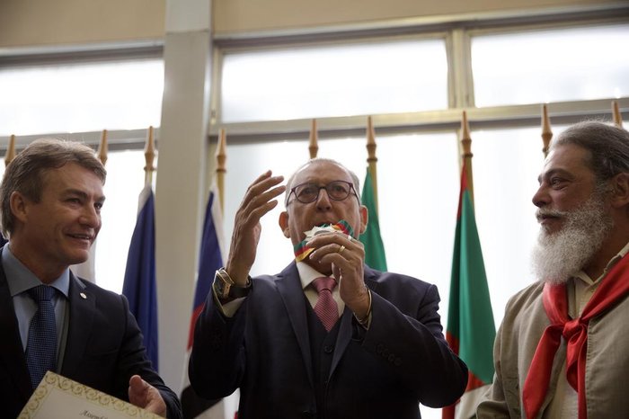 Uma das vozes mais marcantes do jornalismo esportivo brasileiro, Galvão Bueno recebeu nesta terça (13) a Medalha do Mérito Farroupilha. O narrador, de 72 anos, estava acompanhado da esposa Desireé e da filha Leticia, em solenidade no Salão Júlio de Castilhos, da Assembleia Legislativa.