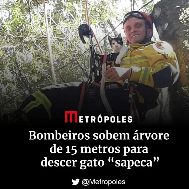 Bombeiros sobem em árvore de 15 metros para descer gato "sapeca"