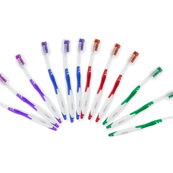 Cabeça com cantos arredondados que facilitam a escovação com cerdas flexíveis de nylon para uma limpeza melhor dos dentes. Dentistas recomendam trocar de escova a cada dois ou três meses, ou quando as cerdas estiverem deformadas ou gastas.