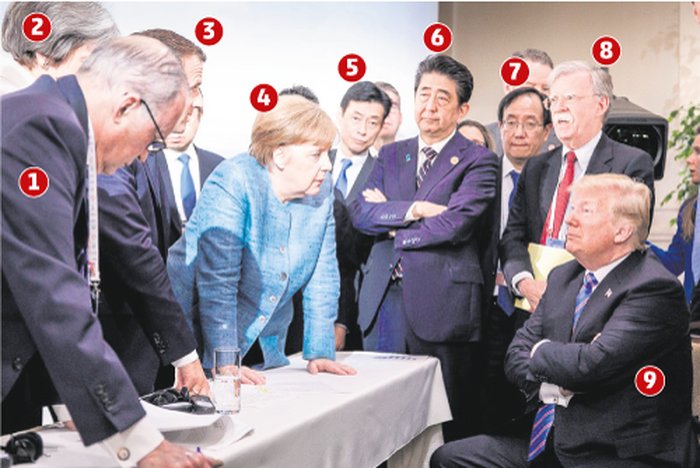Já é uma das imagens do ano. A chanceler alemã, Angela Merkel, cercada de líderes mundiais, em pé, com o corpo avançado sobre Donald Trump, o presidente dos EUA, que aparece sentado. A foto, feita durante o G7, pelo fotógrafo oficial da delegação alemã, Jesco Denzel, foi postada na conta de Merkel no Twitter. Logo viralizou. E deu o tom de um dos encontros do G7 mais tensos da história, por conta das declarações do presidente americano, que retirou seu apoio à declaração final, logo após o encontro.